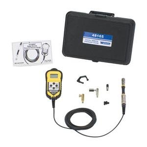 Universal Digital Pressure Gauge with Remote Read The Universal Digital Vacuum/Pressure Gauge with a remote readout is designed to test pressure in various automotive systems such as fuel, transmission, or oil pressure. It is perfect for road testing since the remote readout is easily located inside the vehicle. Rugged, Drop proof all Aluminum case and digital readout. More robust than analog gauges. Remote Readings - fluids stay at the test point. The 10’ cord enables the readout to be inside the vehicle. Digital accuracy - fast repeatable results during injector pressure drop tests. Min/Max feature captures road-test pressure drop-outs. Versatile and accurate - fits most popular pressure test kit adapters.